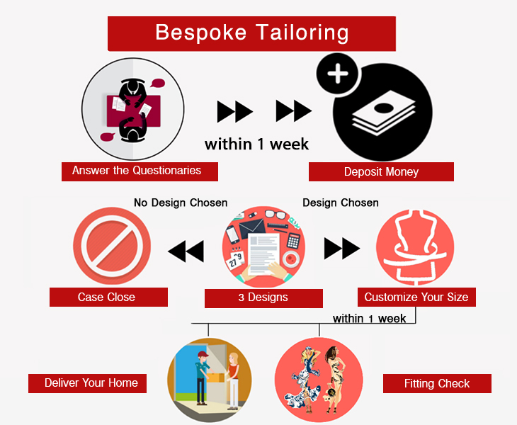 After receiving all the details we will assign one expert designer especially for you and he/she will send the first 3 samples of your clothes to you in less than 7 days, if you like the samples we would like to invite you for “Fitting Session” within 10-15 days.